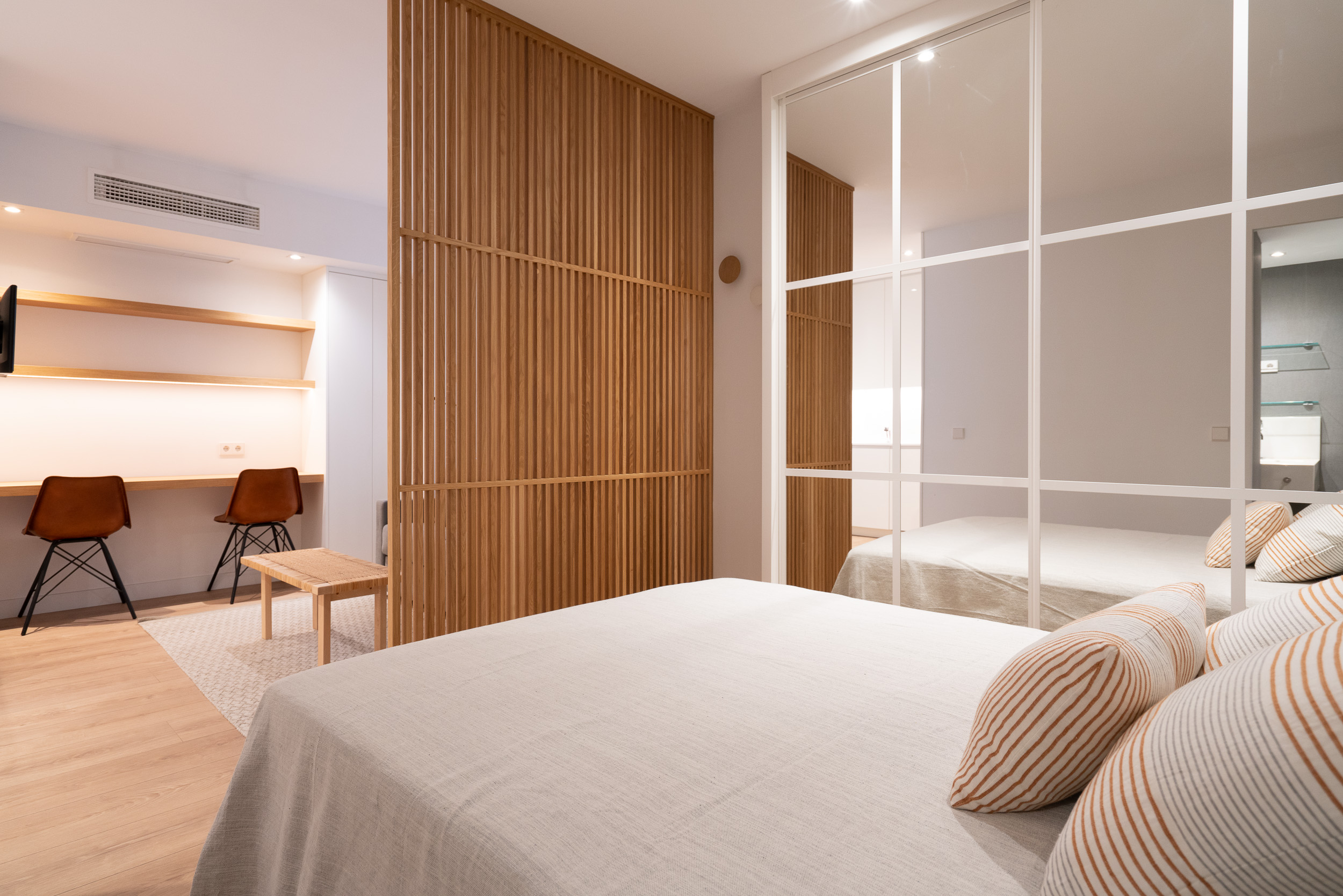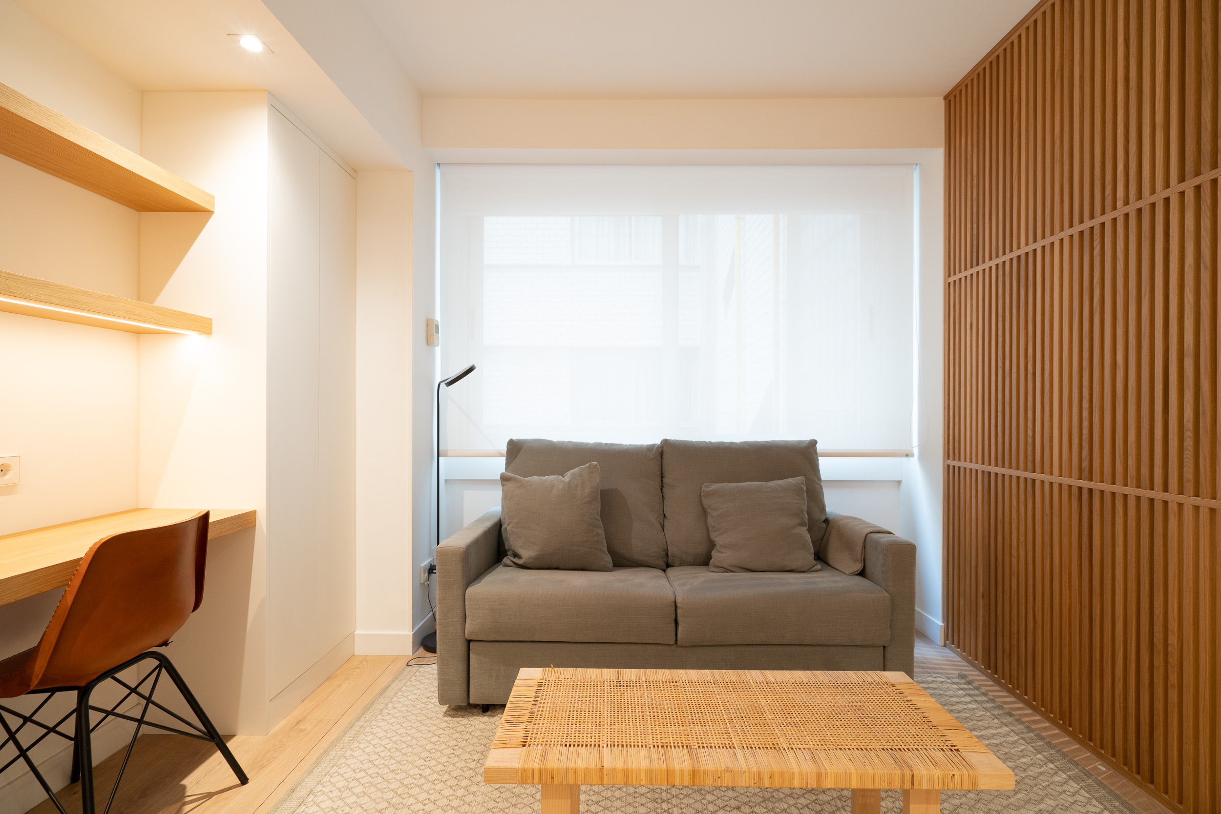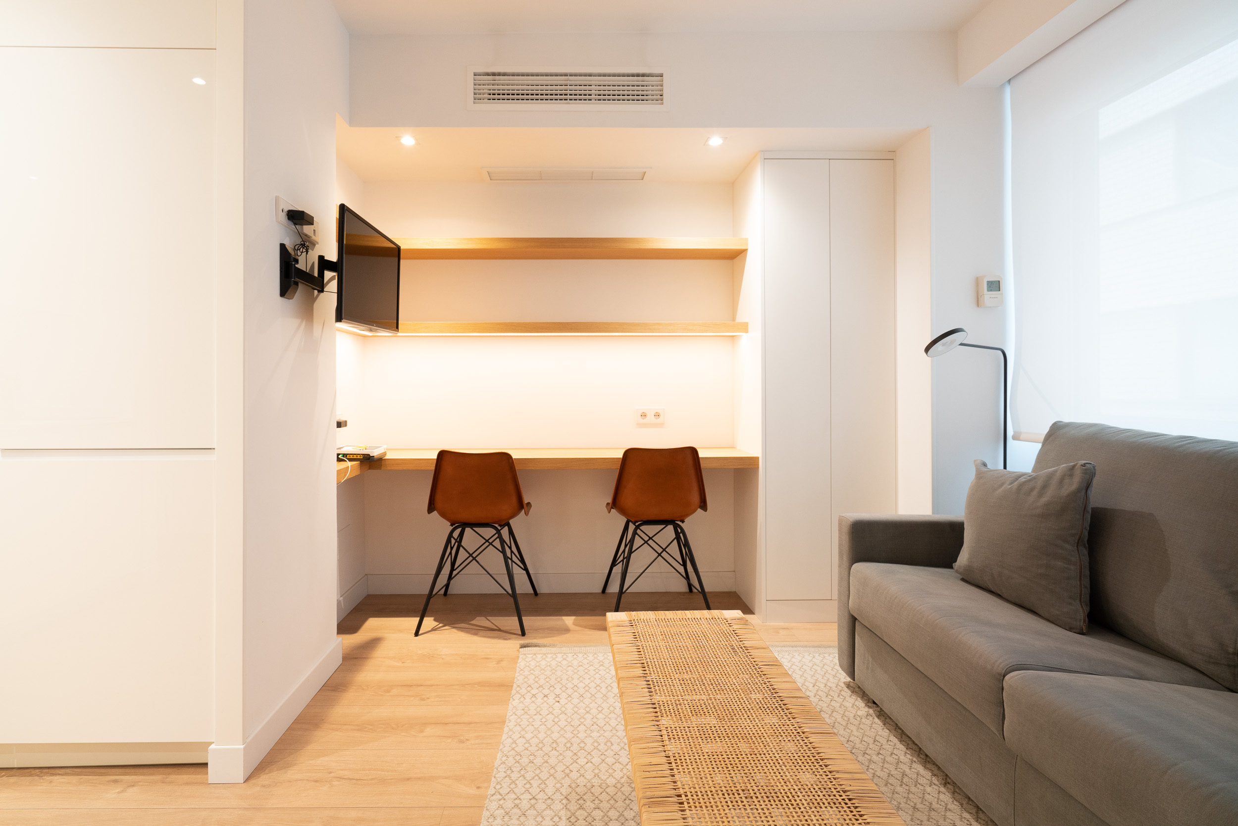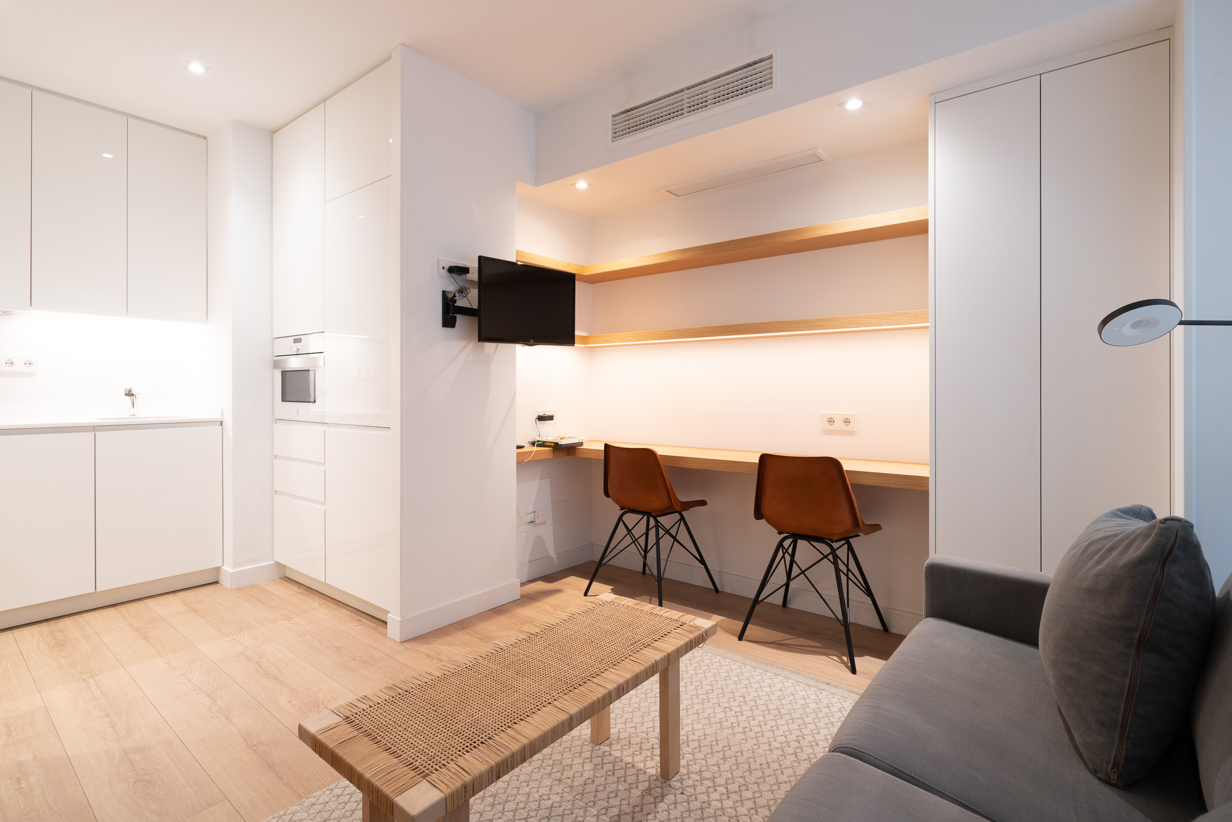Impecable apartamento-estudio, reformado en el Centro Colón. La zona del salón dispone de sofá, convertible en sofá cama, mesita baja y zona de trabajo. Pequeña cocina con todo lo necesario, estupenda nevera con congelador, lavadora, vitro cerámica y microondas. El dormitorio se encuentra dividido de la zona del salón, por unas modernas lamas de madera y comunicado con el cuarto de baño. Grandes armarios empotrados. Calefacción, aire acondicionado y agua caliente individual. ¡Gran seguridad! Portería 24 horas.