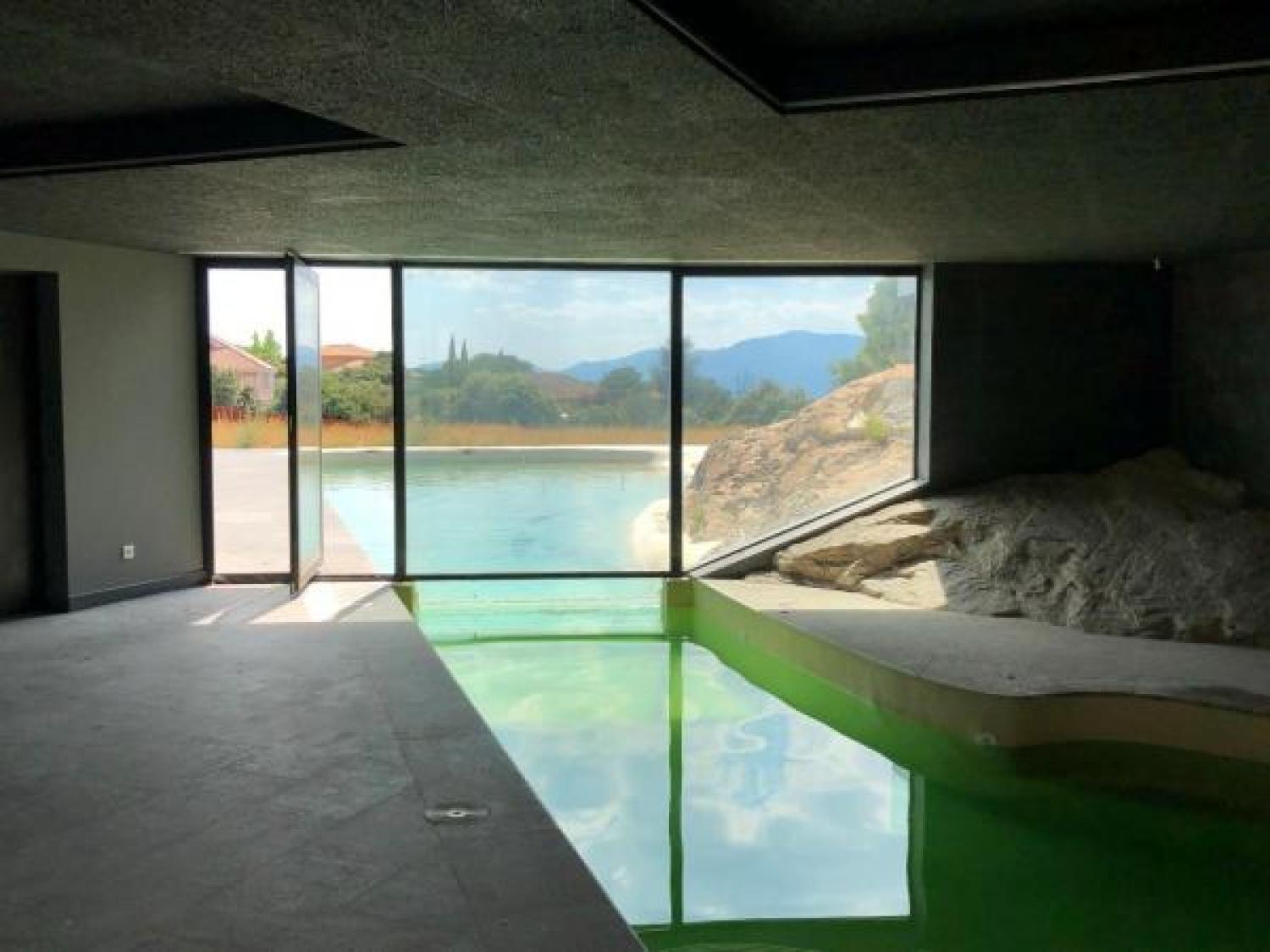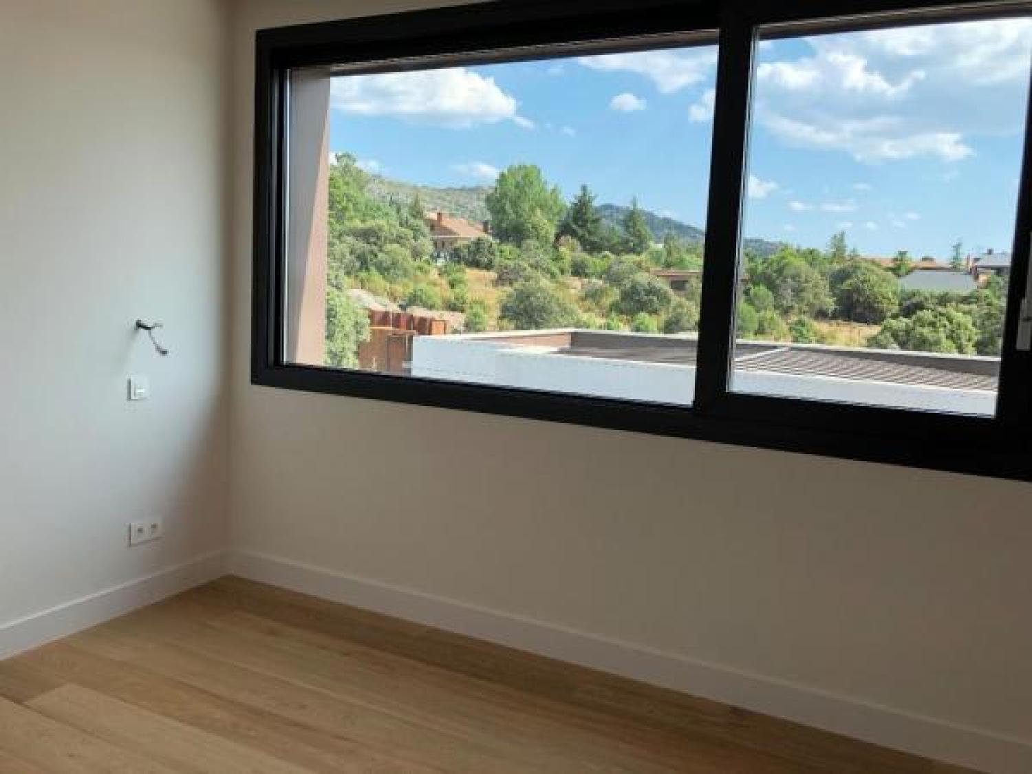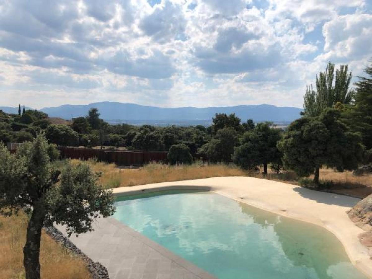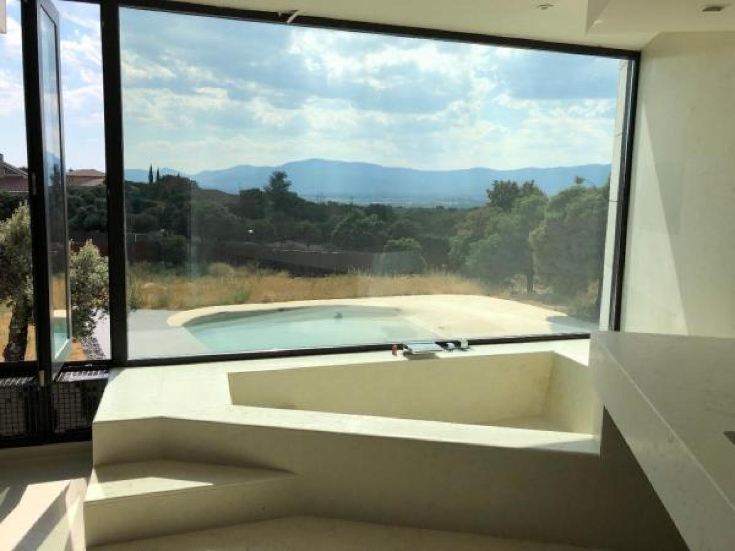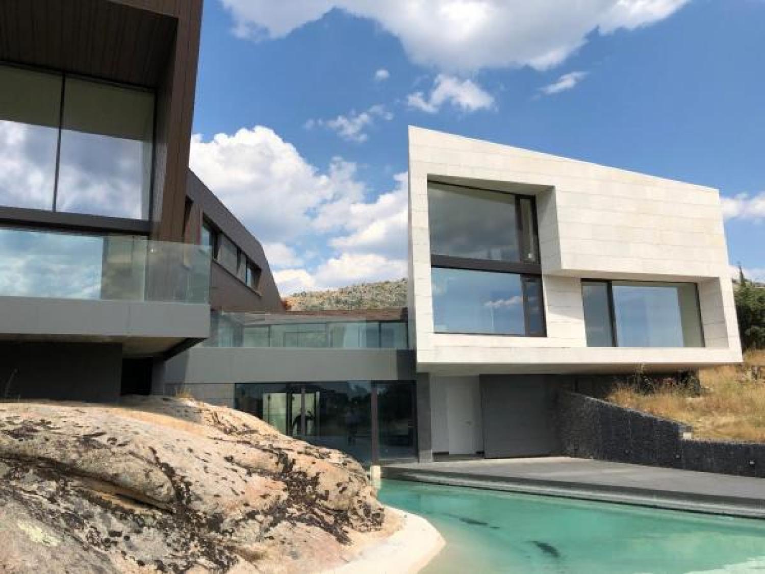 Lujoso chalet independiente de obra nueva y diseño exclusivo en la Urbanización Dominio de Fontenebro, con vigilancia 24h y a tan solo 25 minutos de Madrid. Grandes ventanales hasta el suelo y muchísima luz. Vistas insuperables a Navacerrada, Peña del Águila, Monasterio del Escorial y Cruz de los Caídos. Cuatro dormitorios y cuatro cuartos de baño. Muchos armarios. Dos piscinas, interior y exterior. Gimnasio y sala de cine. Materiales escogidos de primerísima calidad, persianas motorizadas, geotermia y domótica cableada. Parcela muy tranquila y rodeada de encinas protegidas y mucha vegetación.