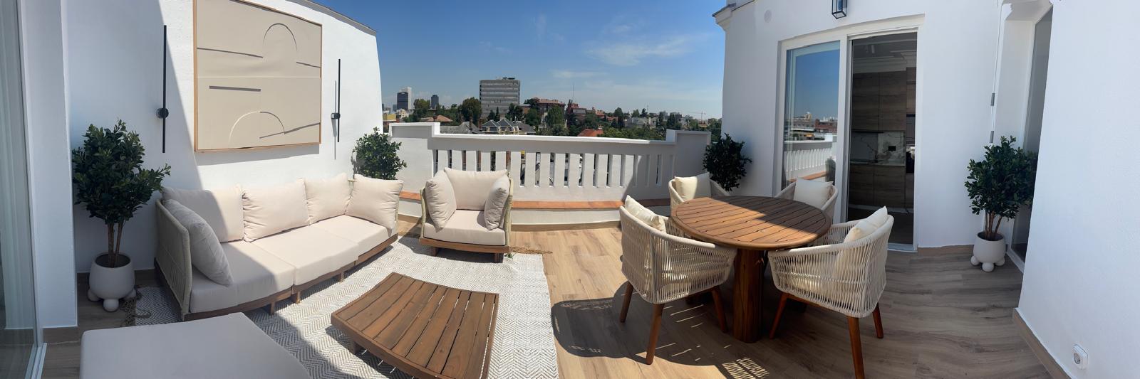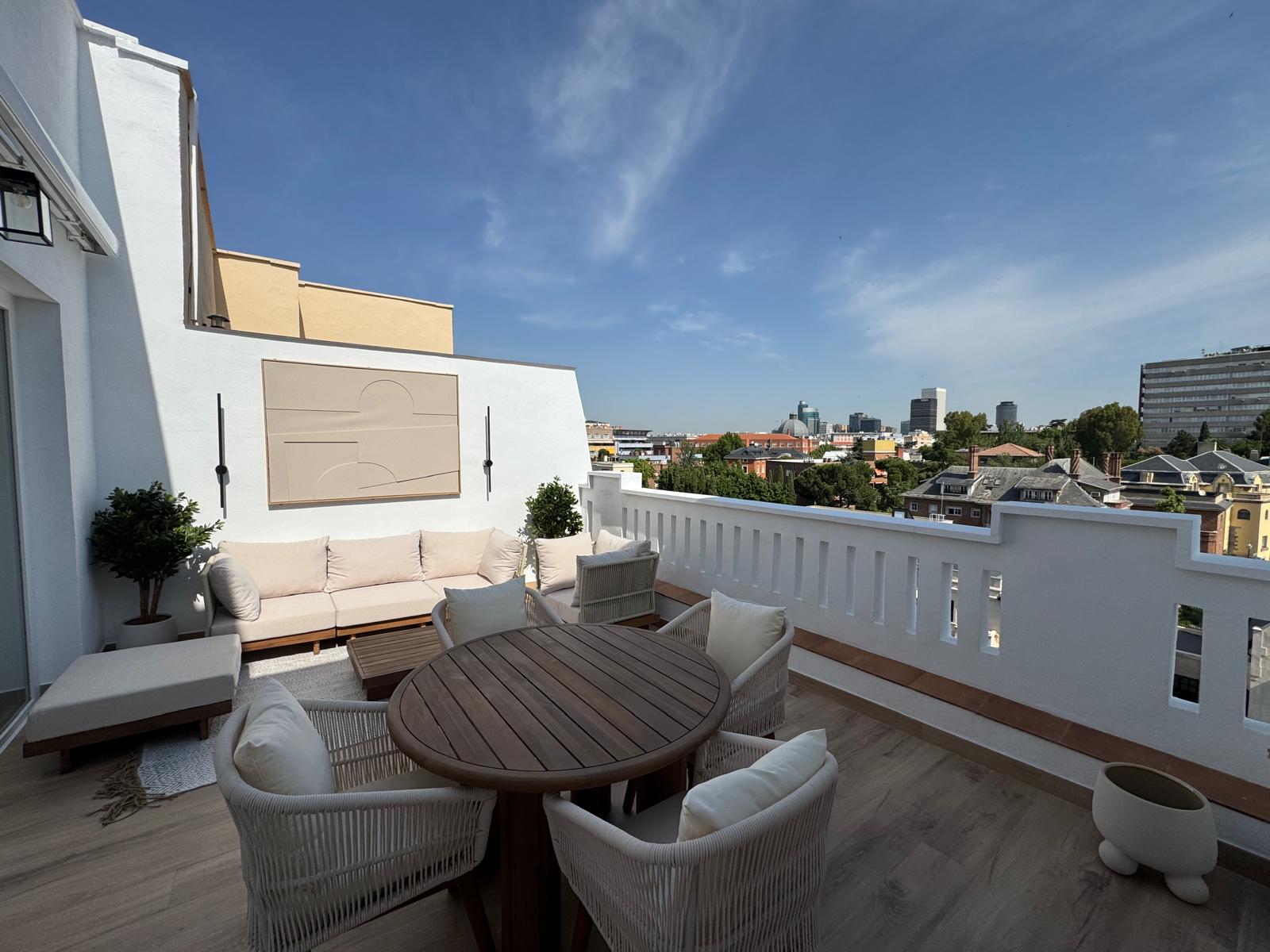 Ático luminoso en la séptima planta de una buena finca en la calle María de Molina. Destaca por su impresionante terraza solárium privada de 20 m² con vistas despejadas.
