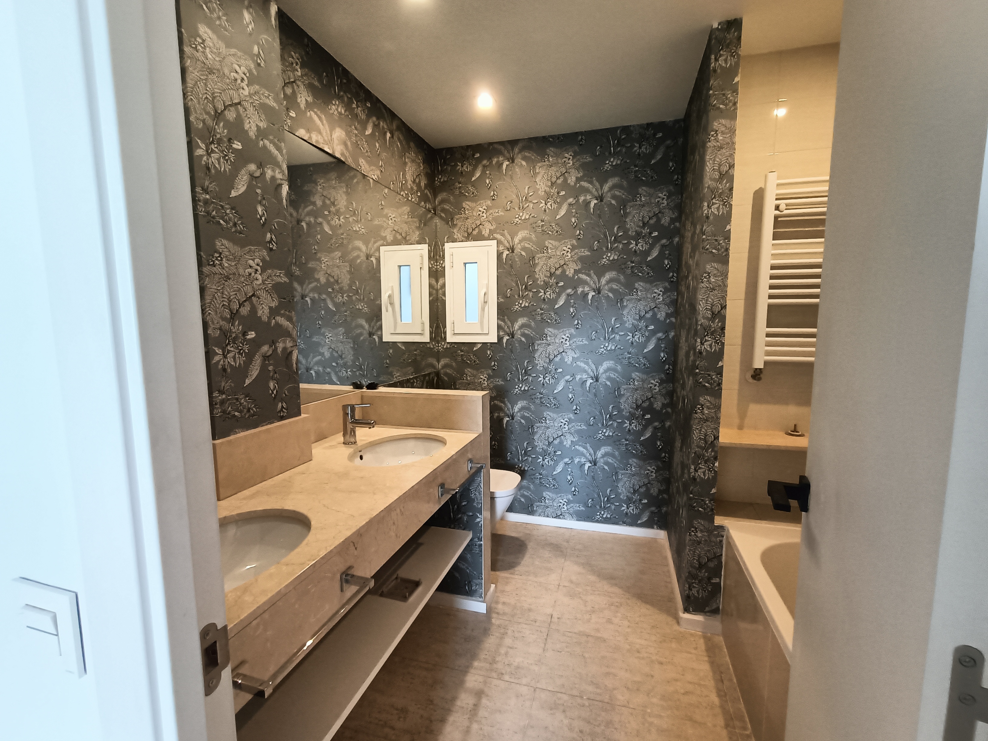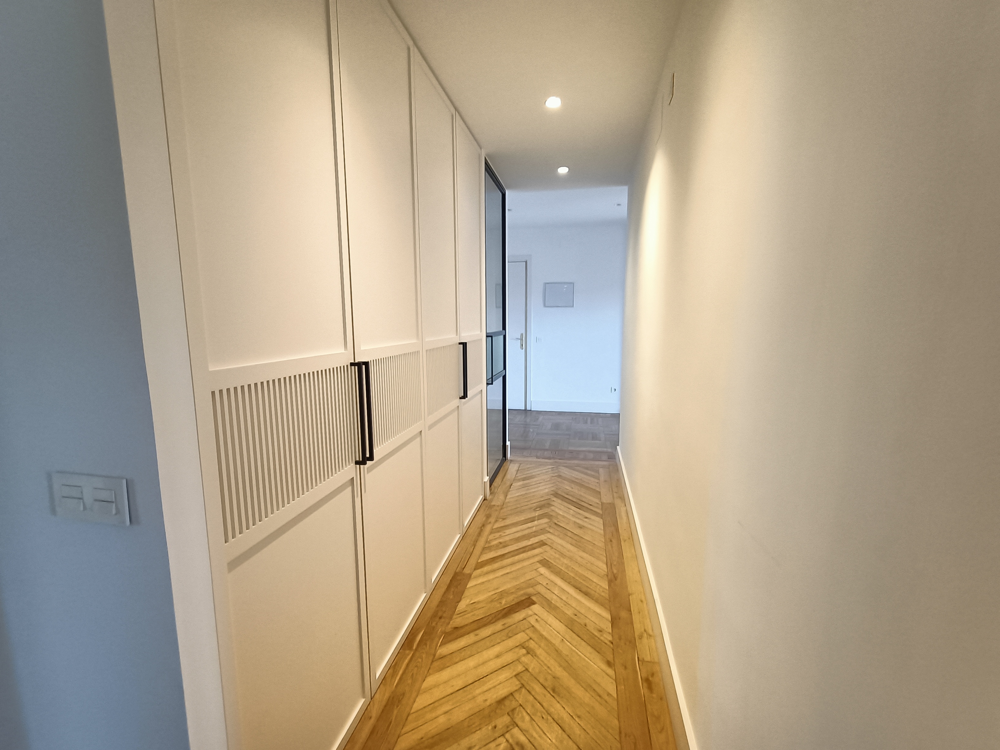 La zona de descanso dispone de tres dormitorios, todos con armarios empotrados, y tres baños completos, dos de ellos en suite, lo que aporta un alto nivel de comodidad. Además, tanto el hall de entrada como el pasillo cuentan con armarios empotrados adicionales, ofreciendo una extraordinaria capacidad de almacenamiento, complementada por un trastero.