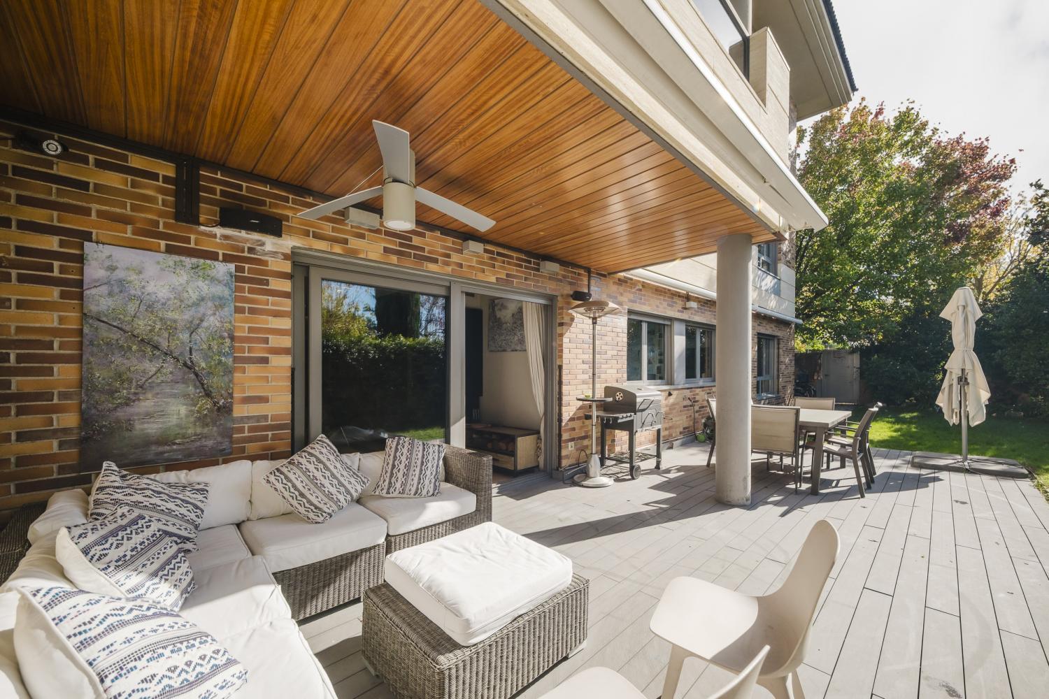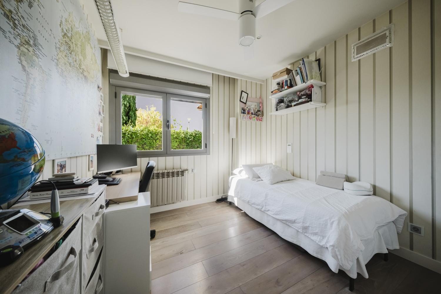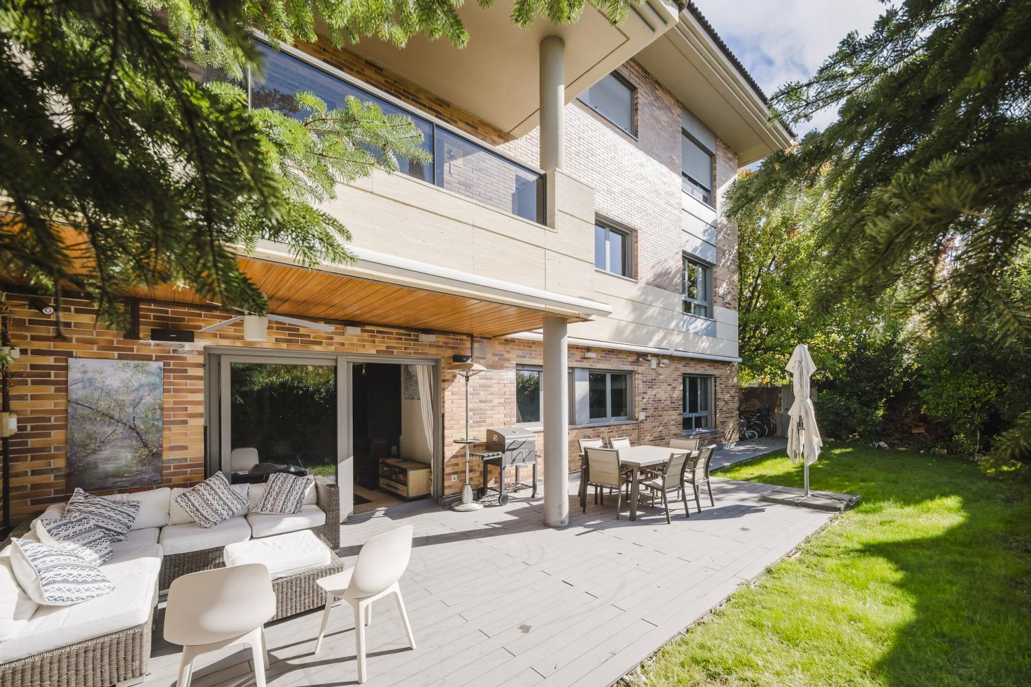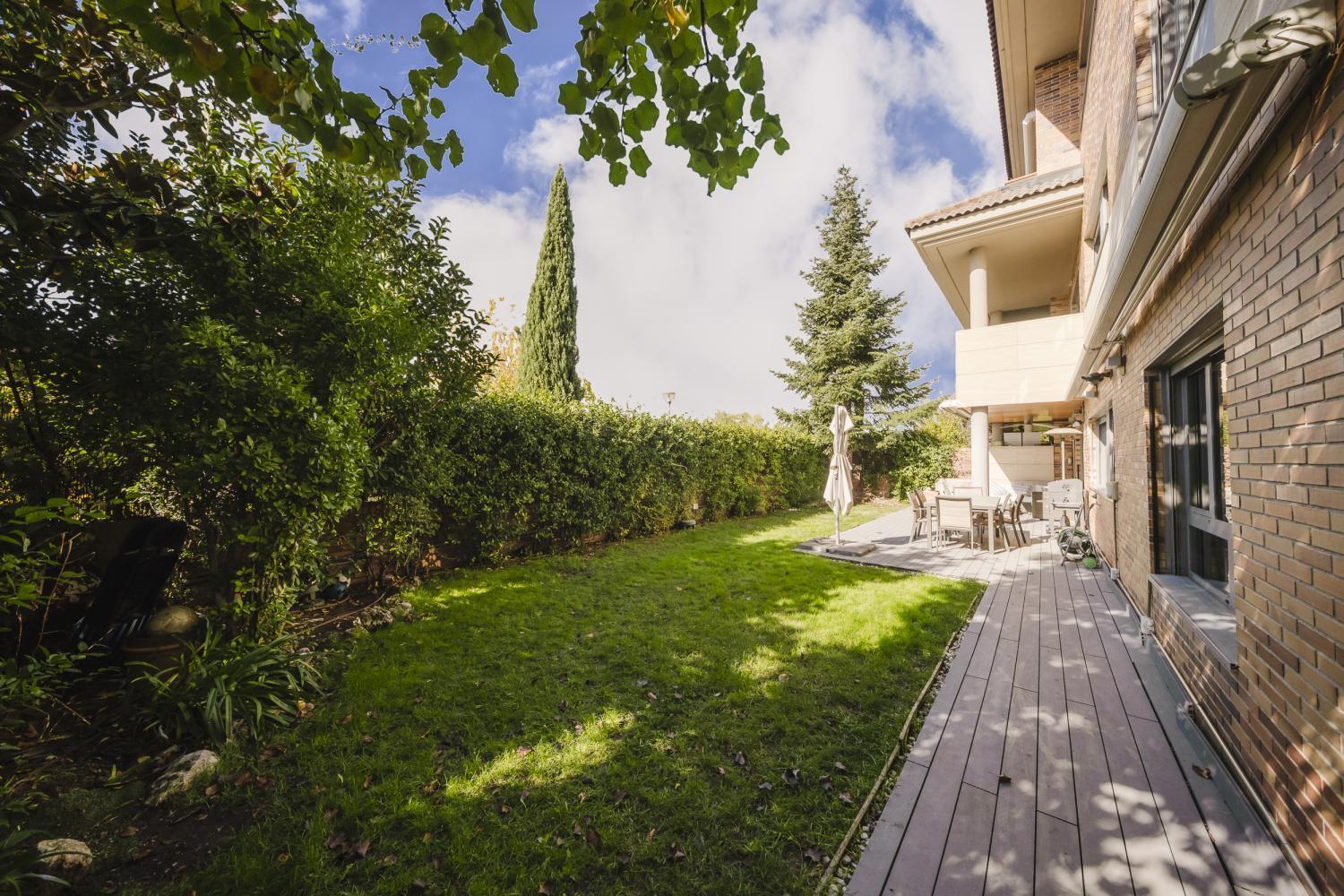 Bonito bajo con Jardín en buena urbanizacion en Valdemarín. La casa tiene muy buena distribución, se accede por el hall que tiene un gran armario gabanero y cuarto de baño de invitados, a la derecha encontramos el salón comedor con un tamaño perfecto, cuadrado y amplio , además cuenta con chimenea en uso. Desde el salón tenemos salida directa al jardín con zona solada y zona de césped, desde el jardín privado se puede acceder directamente al jardín comunitario por medio de una puerta que comunica con el jardín de la comunidad, lo que hace que la casa sea muy cómoda. La cocina, cuenta con gran capacidad de almacenaje y tiene zona de office con una mesa de comedor y banco. En esta zona encontramos el cuarto de servicio con su cuarto de baño. La zona de noche tiene tres cuartos con tres cuartos de baño, el cuarto principal en suite. Así mismo la casa cuenta con un cerramiento de porche que actualmente se usa como cuarto de juegos. Como valor añadido la casa se encuentra totalmente domotizada. Tiene portero en horario de mañana y tarde y en Navidad y durante el mes de agosto tiene seguridad 24h. La urbanización tiene piscina de adultos, piscina infantil y pista de padel. Tiene dos plazas de garaje y trastero.