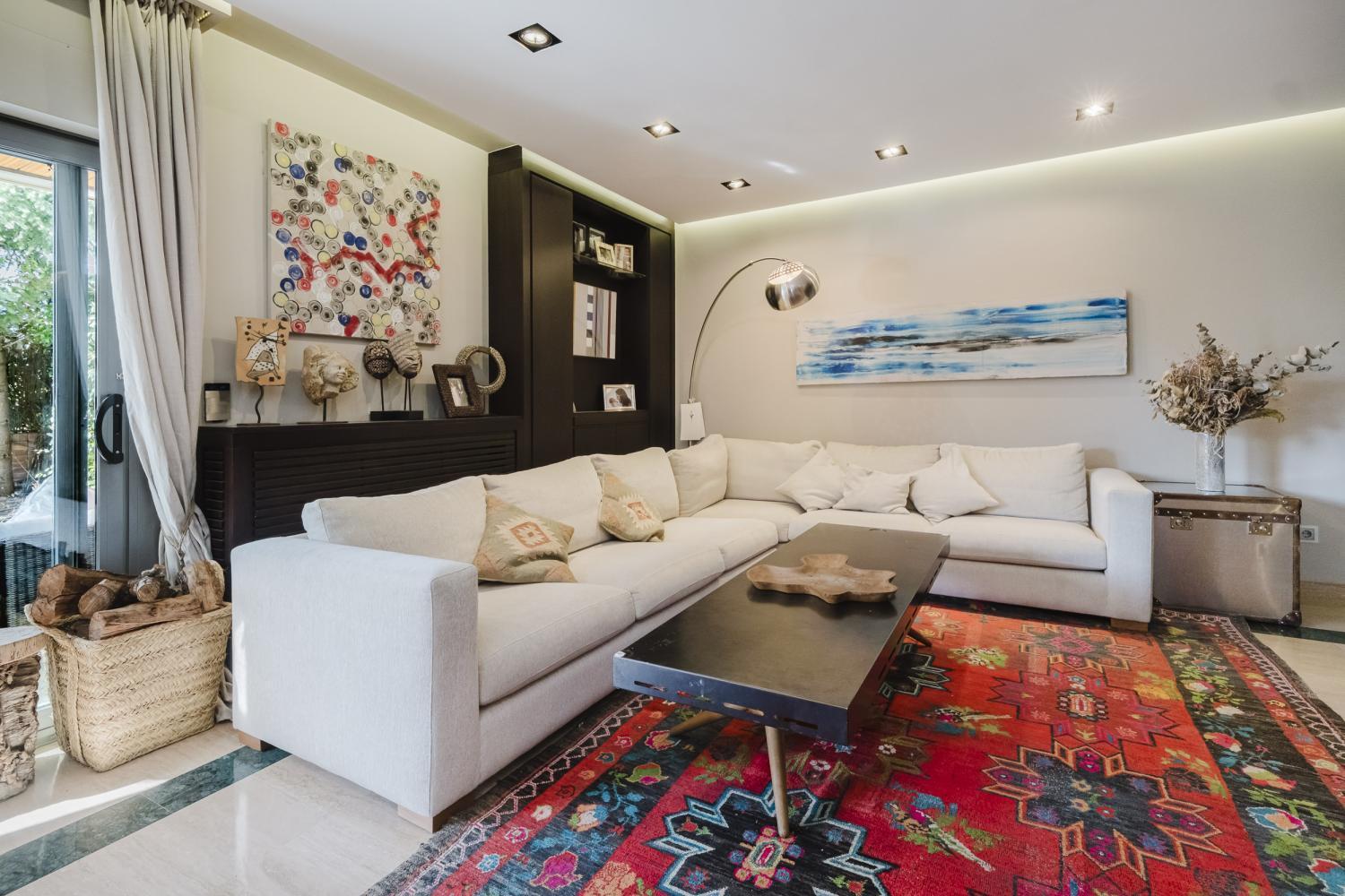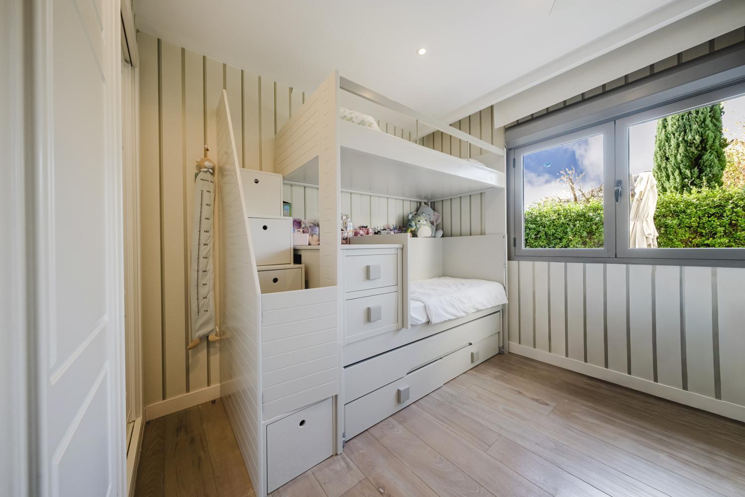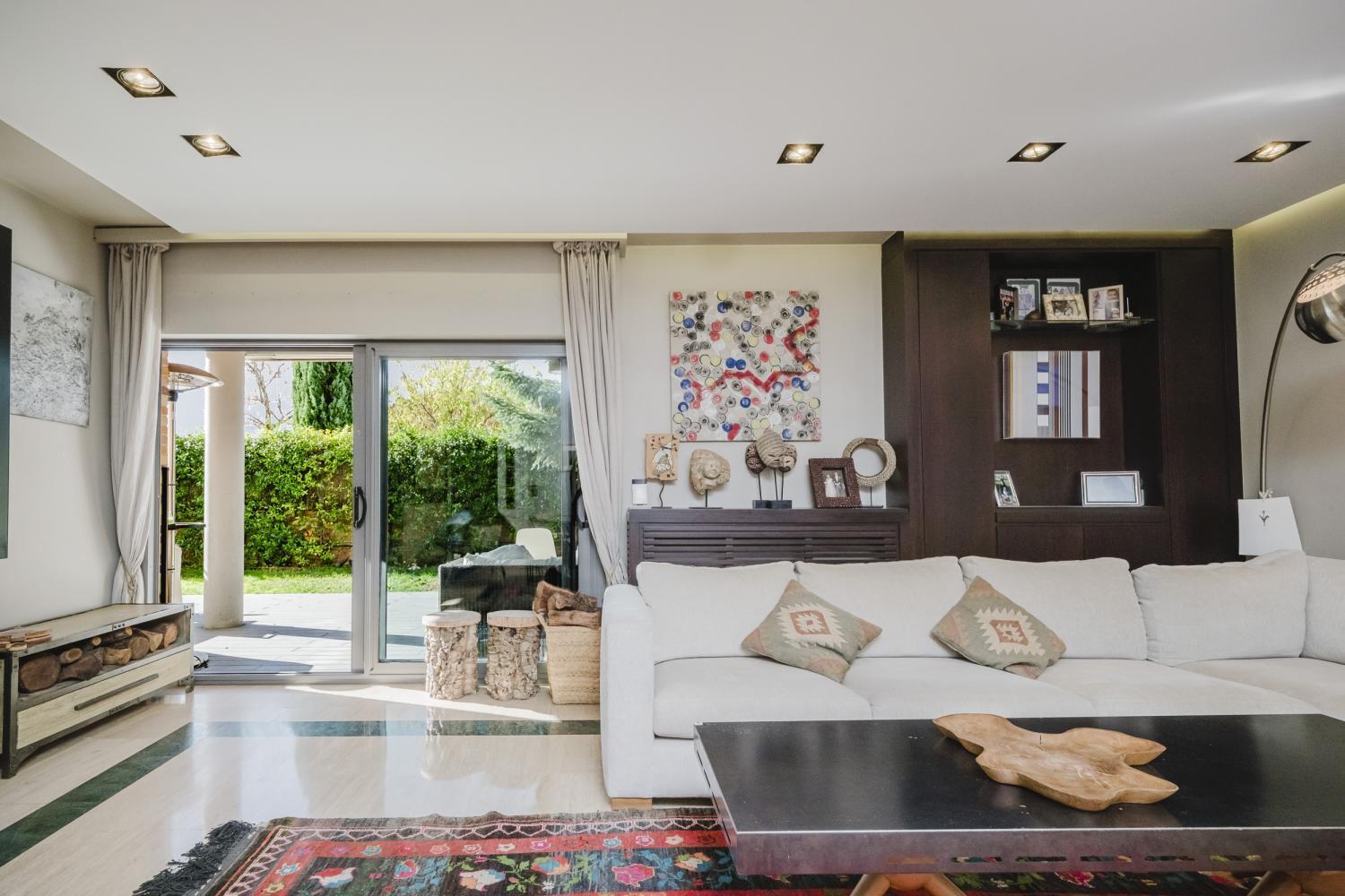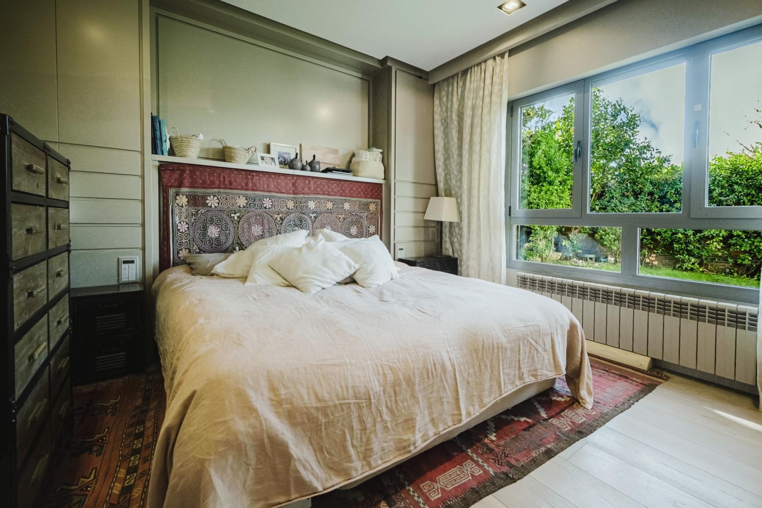 Bonito bajo con Jardín en buena urbanizacion en Valdemarín. La casa tiene muy buena distribución, se accede por el hall que tiene un gran armario gabanero y cuarto de baño de invitados, a la derecha encontramos el salón comedor con un tamaño perfecto, cuadrado y amplio , además cuenta con chimenea en uso. Desde el salón tenemos salida directa al jardín con zona solada y zona de césped, desde el jardín privado se puede acceder directamente al jardín comunitario por medio de una puerta que comunica con el jardín de la comunidad, lo que hace que la casa sea muy cómoda. La cocina, cuenta con gran capacidad de almacenaje y tiene zona de office con una mesa de comedor y banco. En esta zona encontramos el cuarto de servicio con su cuarto de baño. La zona de noche tiene tres cuartos con tres cuartos de baño, el cuarto principal en suite. Así mismo la casa cuenta con un cerramiento de porche que actualmente se usa como cuarto de juegos. Como valor añadido la casa se encuentra totalmente domotizada. Tiene portero en horario de mañana y tarde y en Navidad y durante el mes de agosto tiene seguridad 24h. La urbanización tiene piscina de adultos, piscina infantil y pista de padel. Tiene dos plazas de garaje y trastero.