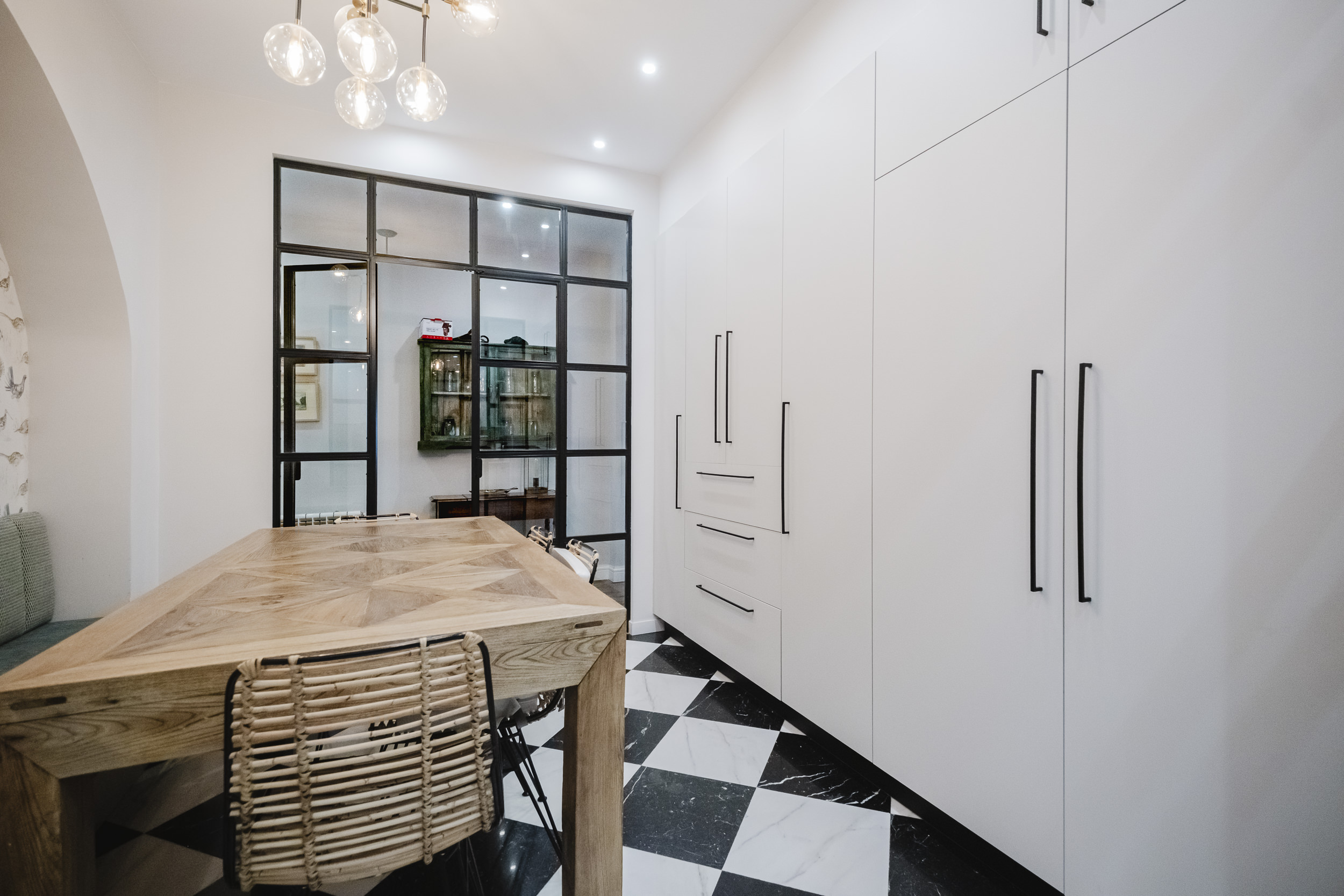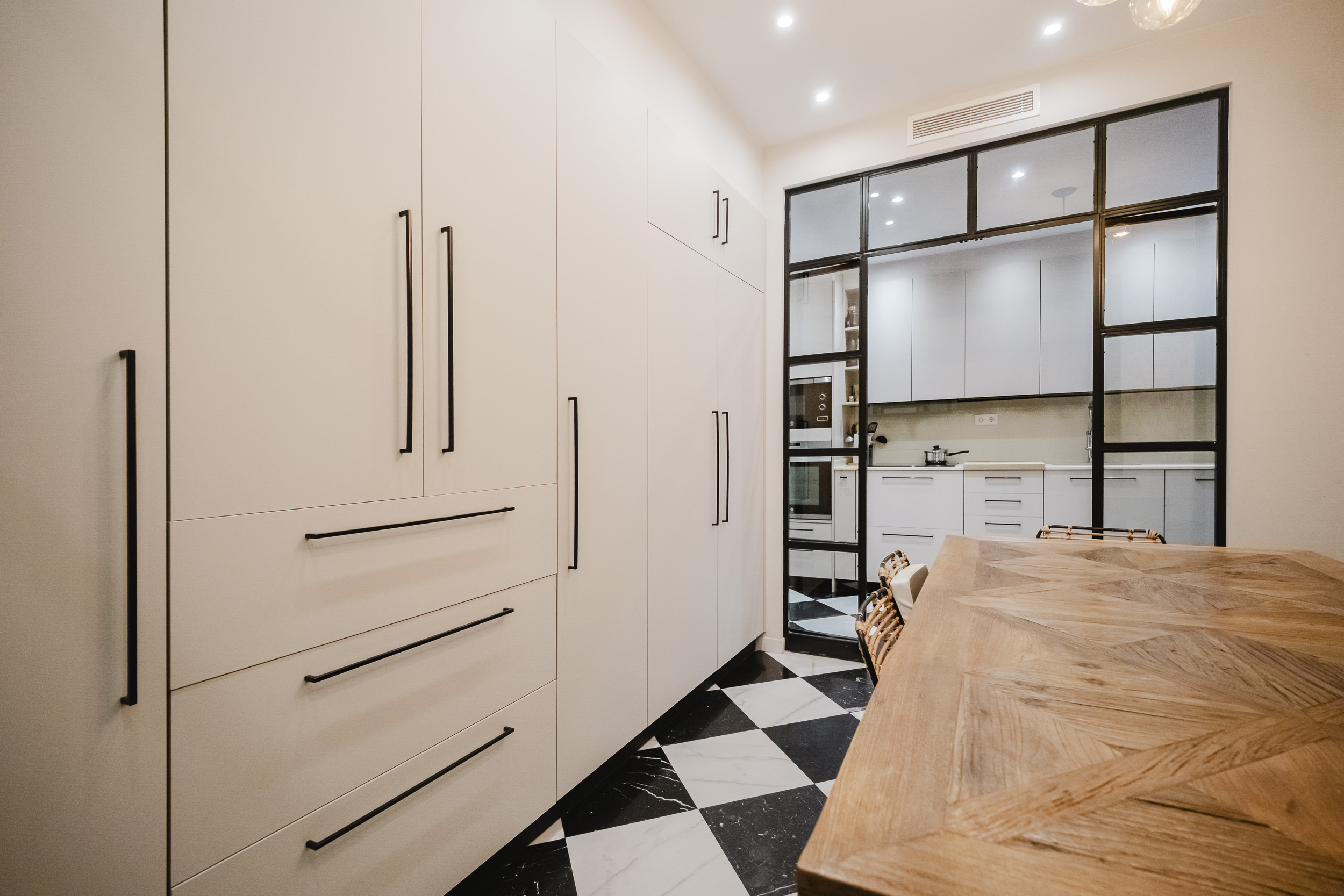 La distribución se estructura en dos zonas claramente diferenciadas. La zona de día destaca por su amplio y luminoso salón, que se abre a un balcón corrido que recorre todo el perímetro. La cocina, de diseño moderno y carpintería de alta calidad, incorpora una práctica zona de office con gran mesa y banco, perfecta para el uso diario. Desde aquí se accede a una lavandería independiente y al área de servicio.