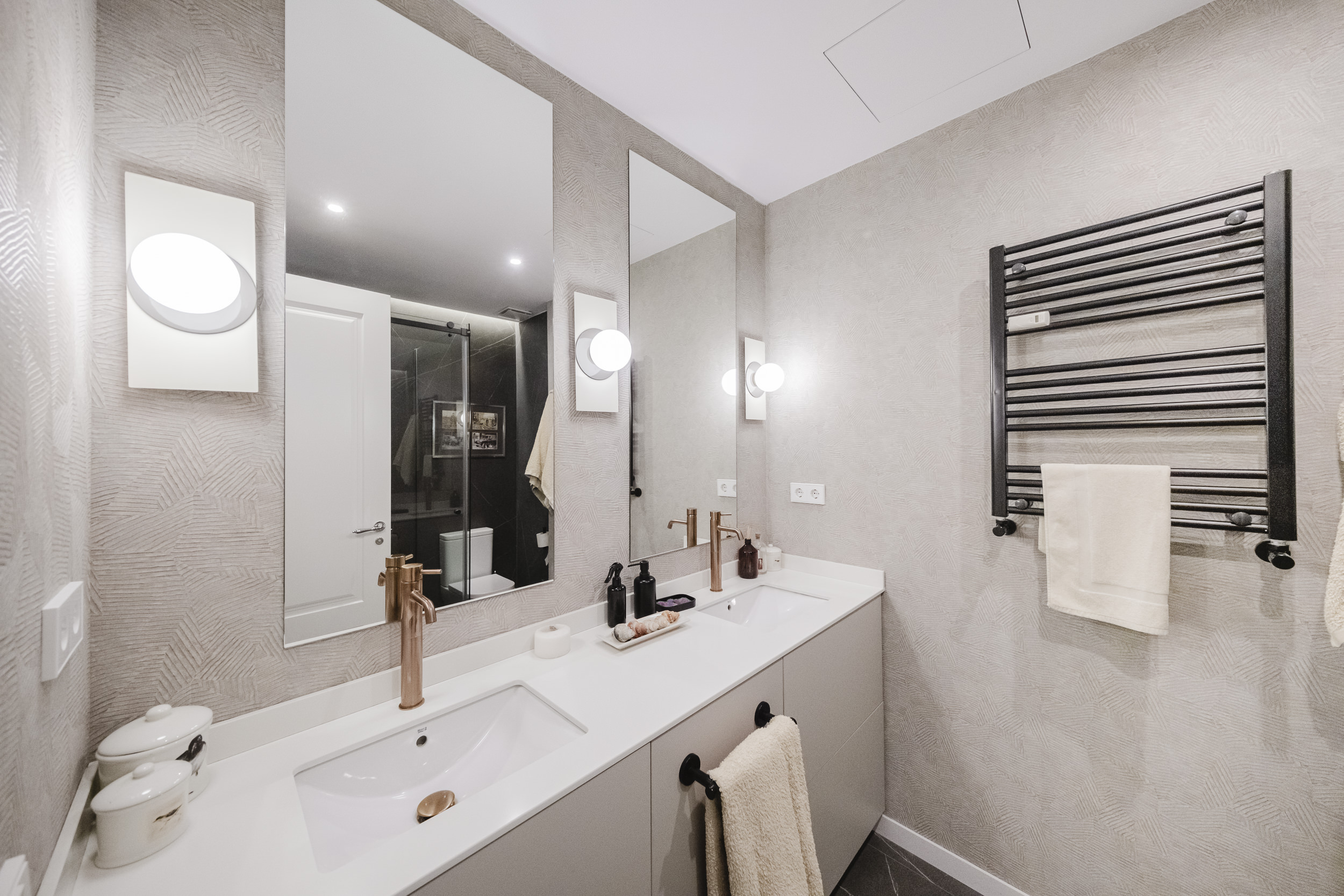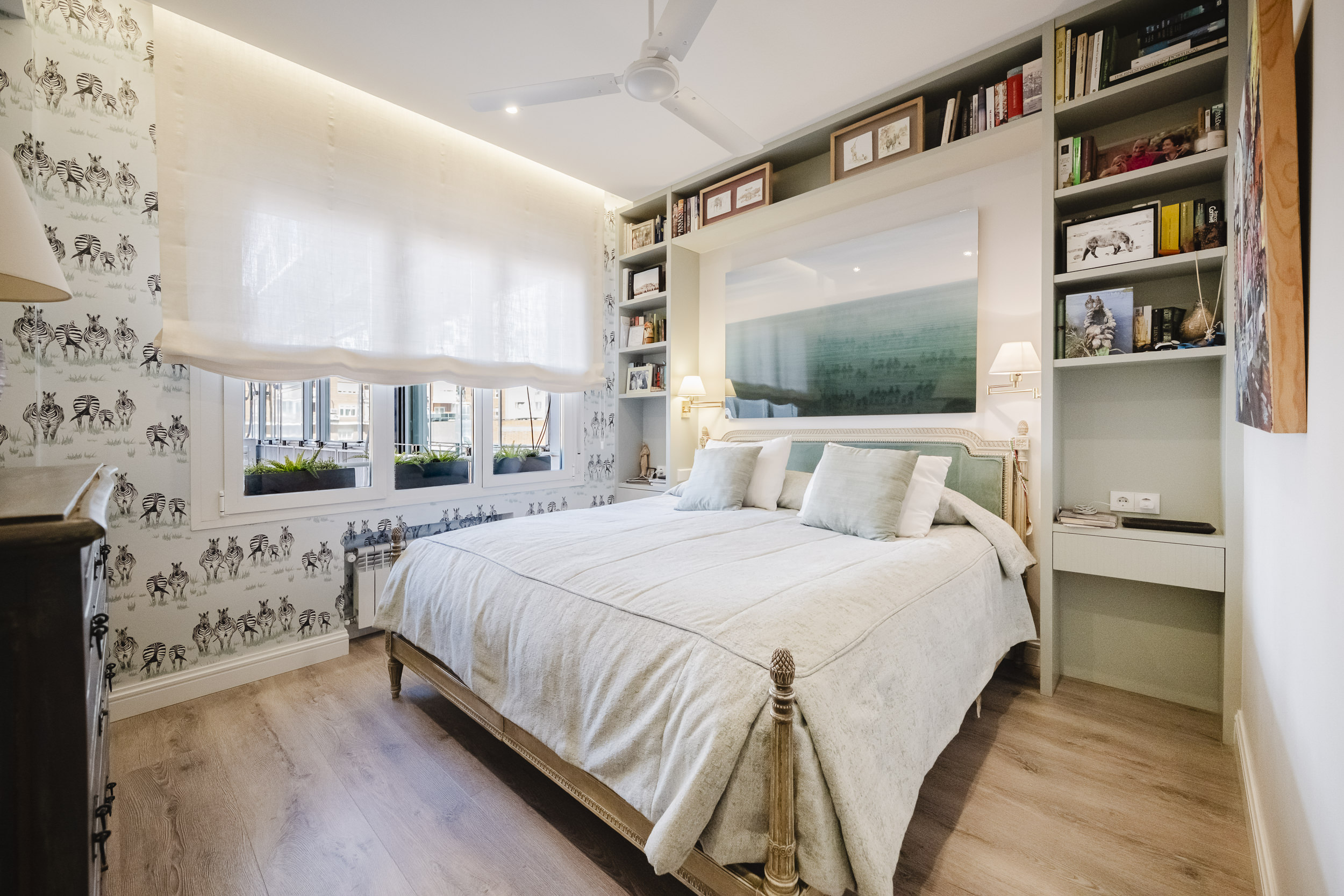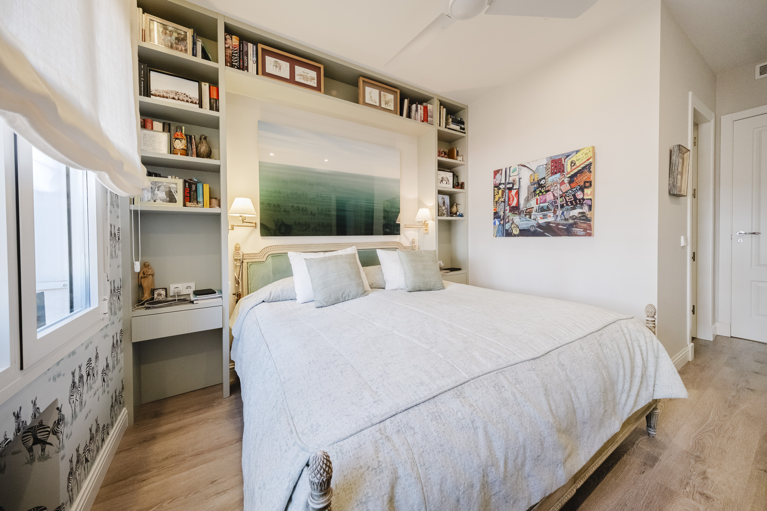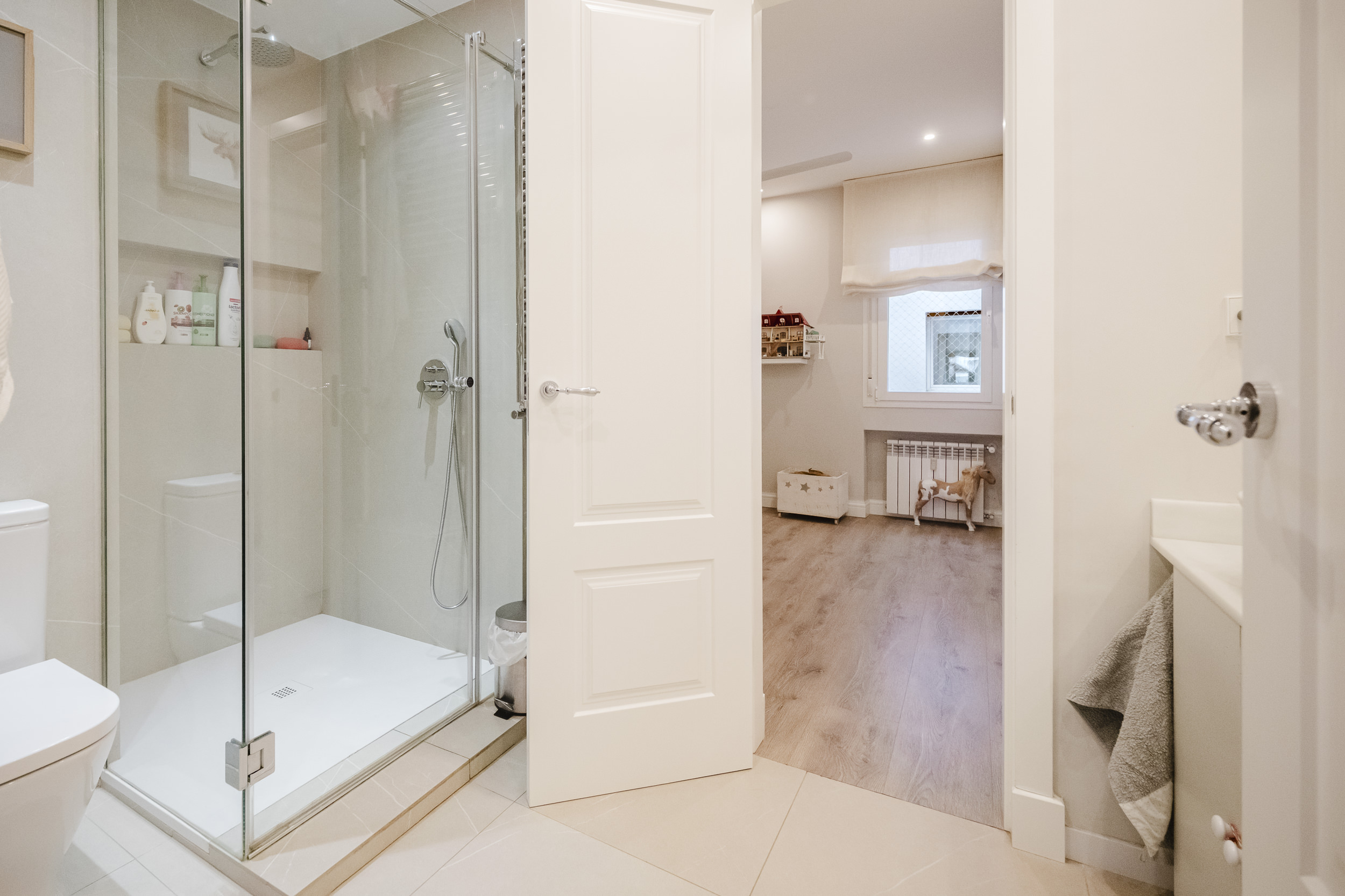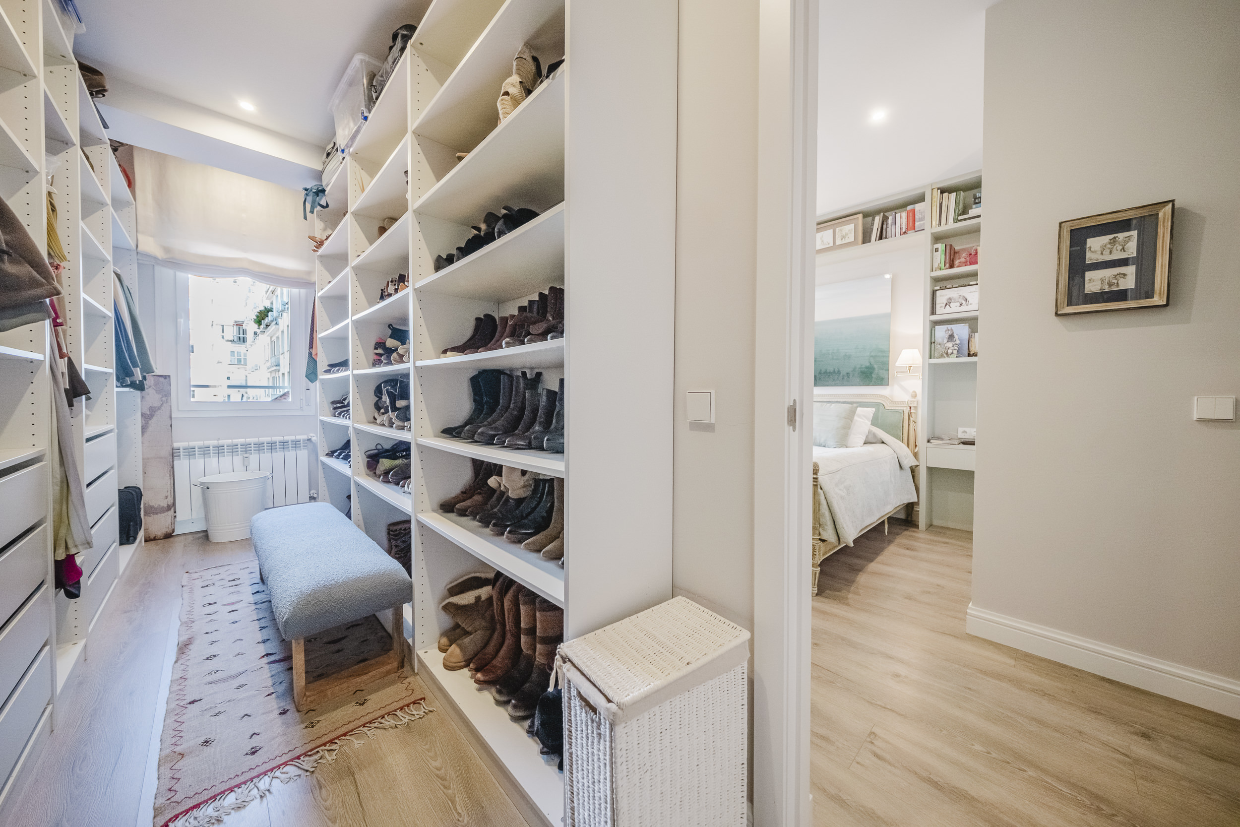 En la zona de noche encontramos tres dormitorios y dos cuartos de baño. El dormitorio principal, de carácter exterior, dispone de baño en suite y un amplio vestidor. El distribuidor cuenta con armarios empotrados que proporcionan una excelente capacidad de almacenamiento. Los otros dos dormitorios, tranquilos y luminosos, dan a un cuidado patio de luces.